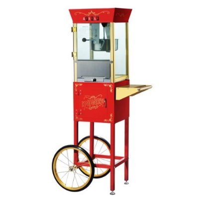 6086 Matinee Movie Red 8 Ounce Features: -Popcorn machine with cart.-Three position control switch.-Tempered glass.-Eight ounce kettle. Includes: -Includes reject kernel tray, kernel, oil scoop and popcorn scoop. Color/Finish: -Red finish. Specifications: -Works on standard 110 volt.-640 watts, 120 volts, 60 Hz and 5.3 amps. Assembly Instructions: -Assembly required. Warranty: -Manufacturer provid
